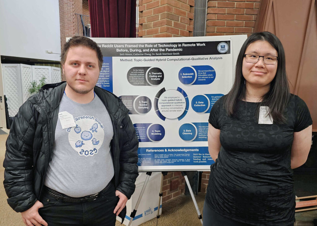 Seth and Catherine presented the Reddit Scraping Project, which analyzes large-scale Reddit discussions to understand how people’s attitudes and behaviors have evolved in response to major societal shifts such as the transition to remote work. Their project combines data scraping, natural language processing, and qualitative analysis to uncover trends in online discourse and community sentiment.